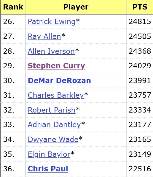 排在德羅贊之前的是勇士球星庫里(24029分)。