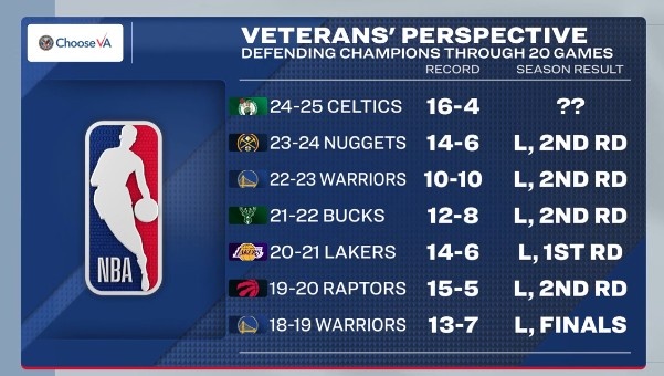 除特別注明外,本站所有內容均為24直播網整理排版,轉載請注明出處:近7個賽季衛(wèi)冕冠軍前20場戰(zhàn)績綠軍最優(yōu) 22-23賽季勇士最差