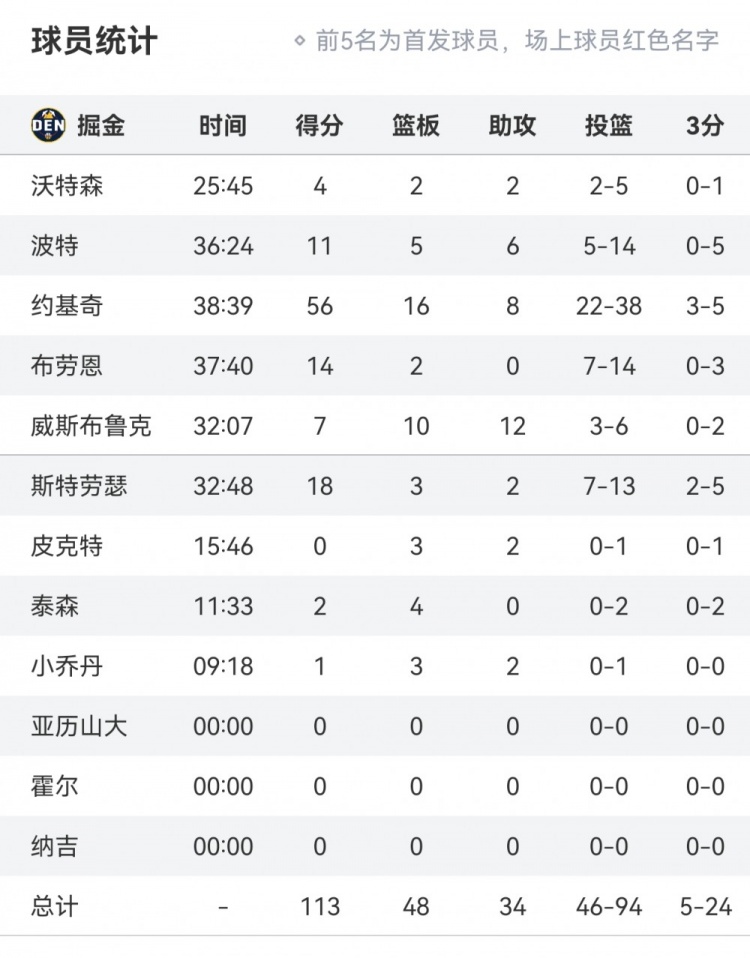 值得一提的是,本場約基奇?zhèn)€人三分5中3,而隊友三分共計19中2。