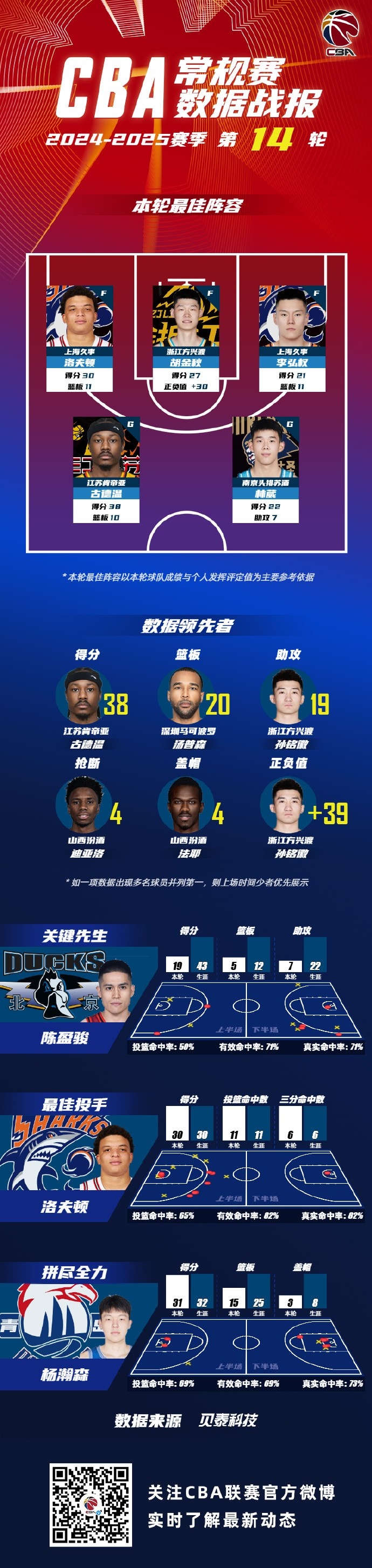 2024-2025賽季CBA聯(lián)賽常規(guī)賽第14輪結(jié)束較量,來自上海久事的洛夫頓、浙江廣廈籃球俱樂部的胡金秋、上海久事的李弘權(quán)、江蘇肯帝亞籃球俱樂部的古德溫和南京同曦籃球俱樂部的林葳入選CBA聯(lián)賽常規(guī)賽第14輪最佳陣容!