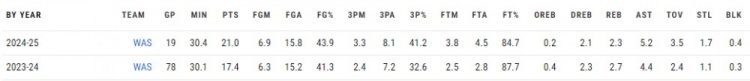 而在上賽季,普爾出戰(zhàn)78場(chǎng)比賽,場(chǎng)均30.1分鐘得到17.4分2.7籃板4.4助攻1.1搶斷0.3蓋帽,三項(xiàng)命中率為41.3/32.6/87.7%。