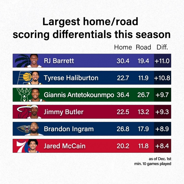 發(fā)布時間:2024年12月03日 17:21點(diǎn)擊:欄目:籃球新聞 備注:數(shù)據(jù)截至昨日,每名球員至少參加10場比賽 除特別注明外,本站所有內(nèi)容均為24直播網(wǎng)整理排版,轉(zhuǎn)載請注明出處:本賽季主客場得分差:巴雷特11分排第一 哈利第二 魔仙哥上榜 本文標(biāo)簽: nba 籃球 西部 東部 猛龍 雄鹿 字母哥 76人 鵜鶘 英格拉姆 步行者