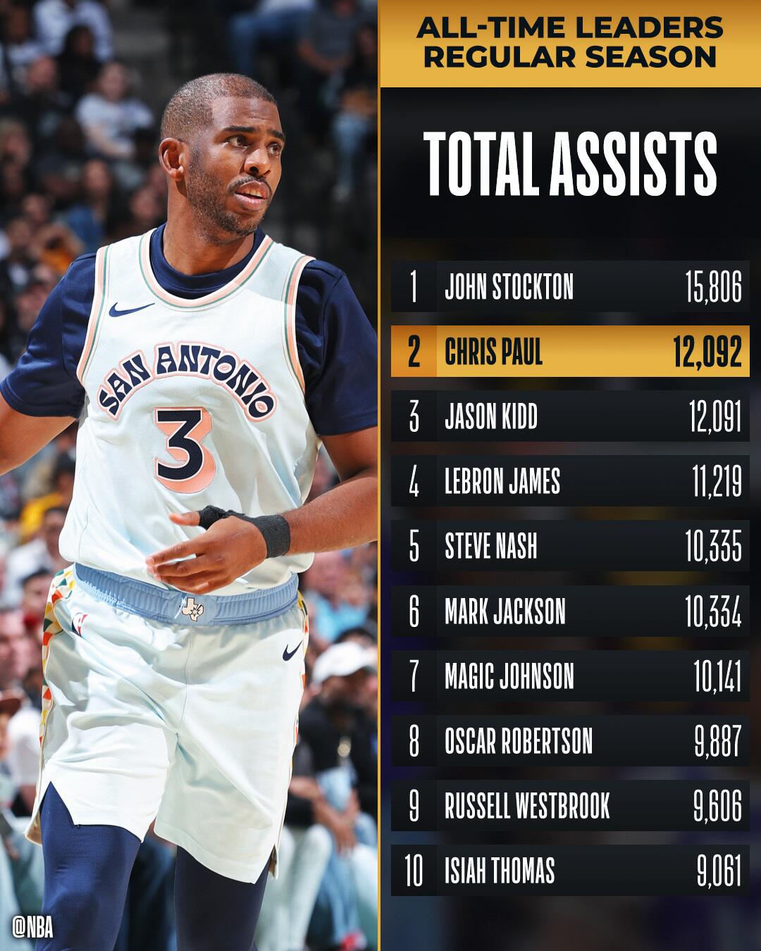 保羅在首節(jié)0助攻進(jìn)賬的情況下,次節(jié)連續(xù)送出3個(gè)助攻,生涯總助攻達(dá)到12092個(gè),超越基德來(lái)到NBA歷史第二,排在第一的是斯托克頓(15806個(gè))。