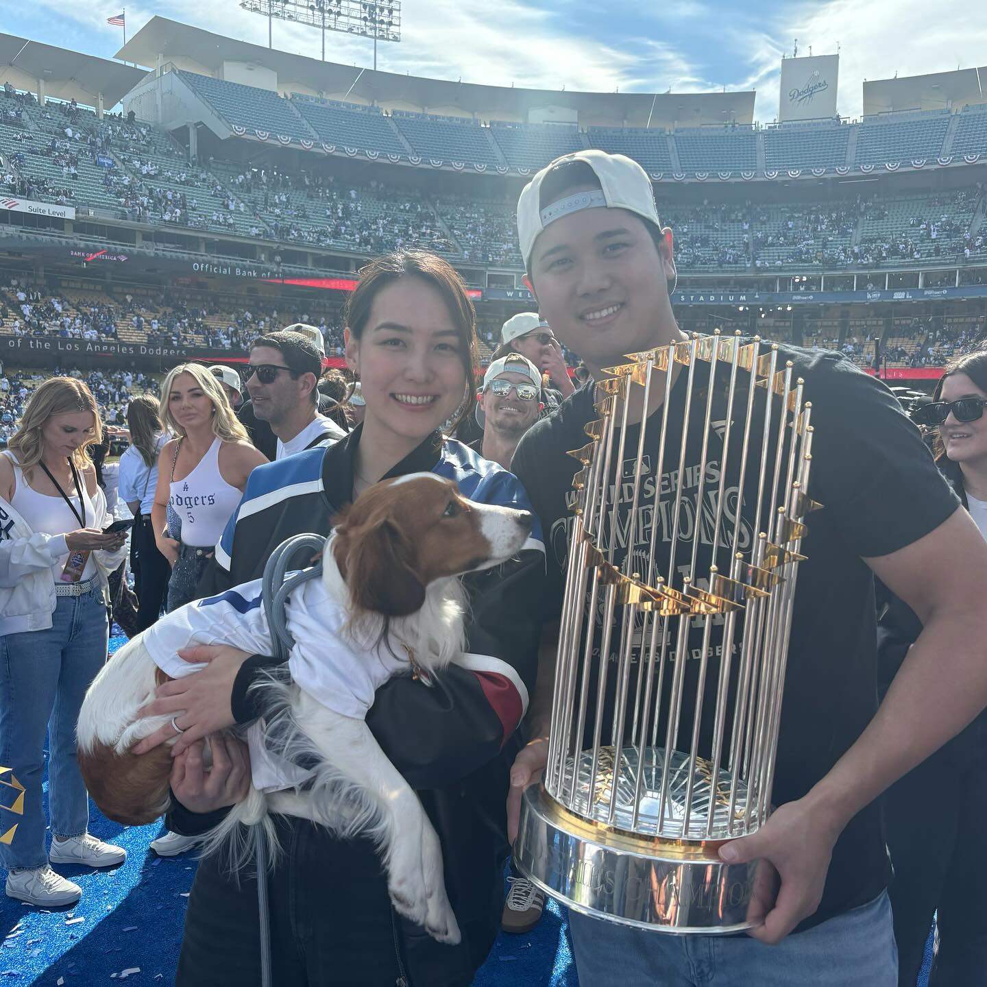 美職棒同城球隊(duì)洛杉磯道奇球星大谷翔平攜妻子田中真美子做客湖人主場(chǎng),并收到了定制球衣(大谷翔平在道奇穿17號(hào))。