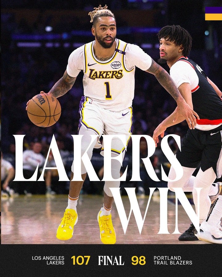賽后湖人官推曬出本場(chǎng)贏球海報(bào),拉塞爾成為封面人物。