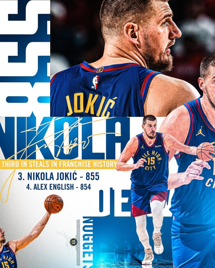 本場比賽過后,約基奇的隊史搶斷數(shù)來到856次(圖中為比賽中2搶斷時的數(shù)據(jù)),超越名宿英格利什,上升至掘金隊史第三位。