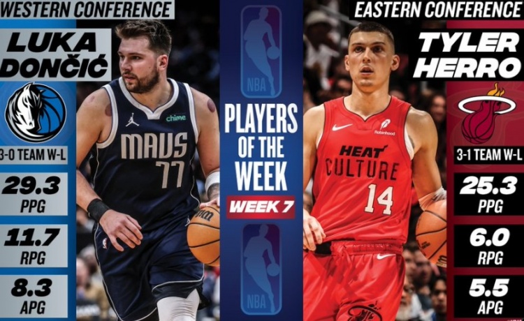 12月10日訊 今日NBA官方宣布,獨(dú)行俠的東契奇、熱火的希羅當(dāng)選為本賽季第七周東西部周最佳球員。