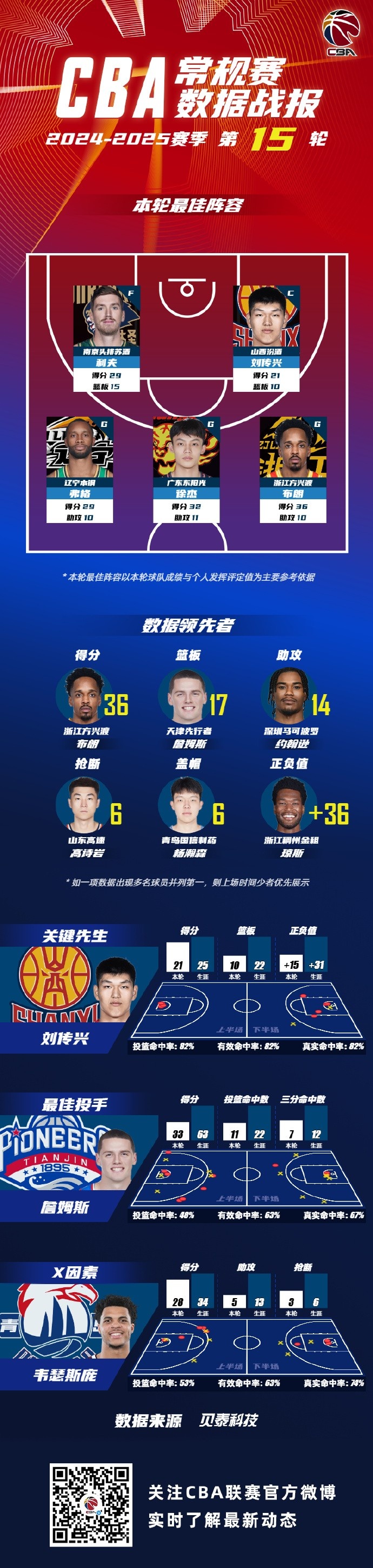 2024-2025賽季CBA聯(lián)賽常規(guī)賽第15輪結(jié)束較量,來(lái)自同曦的利夫、山西的劉傳興、遼寧的弗格 、廣東的徐杰和廣廈的布朗入選CBA聯(lián)賽常規(guī)賽第15輪最佳陣容!