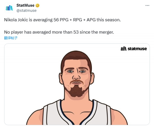 StatMuse:約基奇本賽季場(chǎng)均得分、籃板和助攻總和超過(guò)56,NBA和ABA合并(1976年)以來(lái)在這項(xiàng)數(shù)據(jù)上沒(méi)有球員能超過(guò)53。