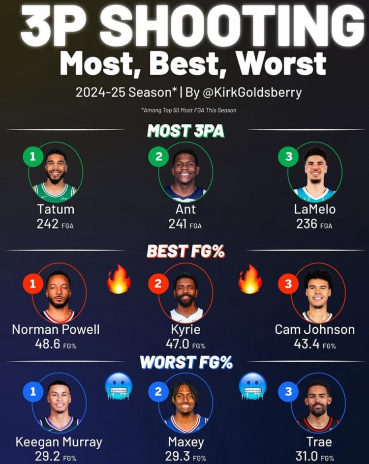 12月11日訊 昨天,數(shù)據(jù)專家Kirk Goldsberry盤點(diǎn)了一些本賽季目前有關(guān)三分的數(shù)據(jù),具體如下: