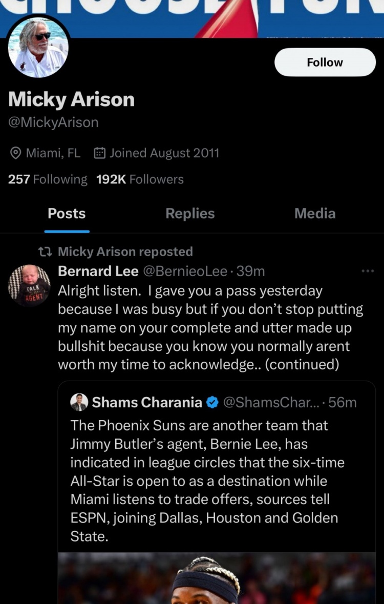 熱火老板米奇-阿里森轉(zhuǎn)發(fā)了伯納德-李的推文。