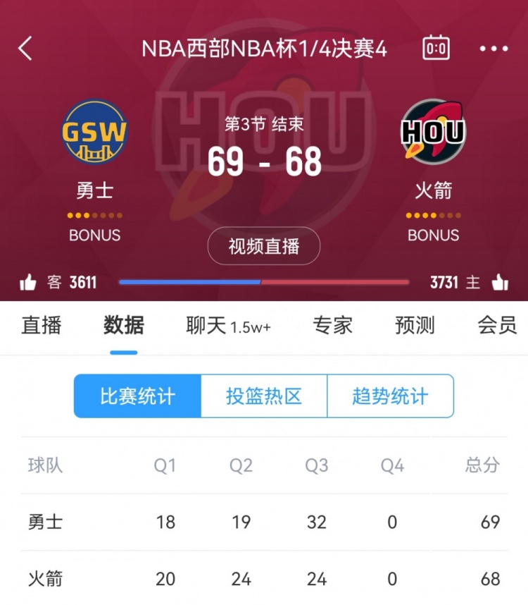 12月12日訊 NBA西部NBA杯1/4決賽,火箭主場(chǎng)對(duì)陣勇士的比賽正在進(jìn)行。