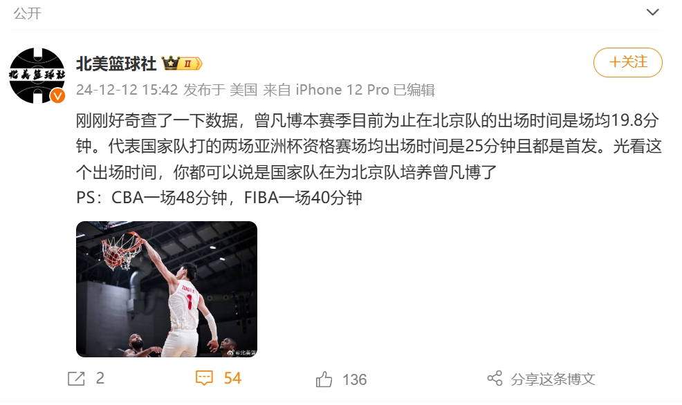 “剛剛好奇查了一下數(shù)據(jù),曾凡博本賽季目前為止在北京隊的出場時間是場均19.8分鐘。代表國家隊打的兩場亞洲杯資格賽場均出場時間是25分鐘且都是首發(fā)。光看這個出場時間,你都可以說是國家隊在為北京隊培養(yǎng)曾凡博了。