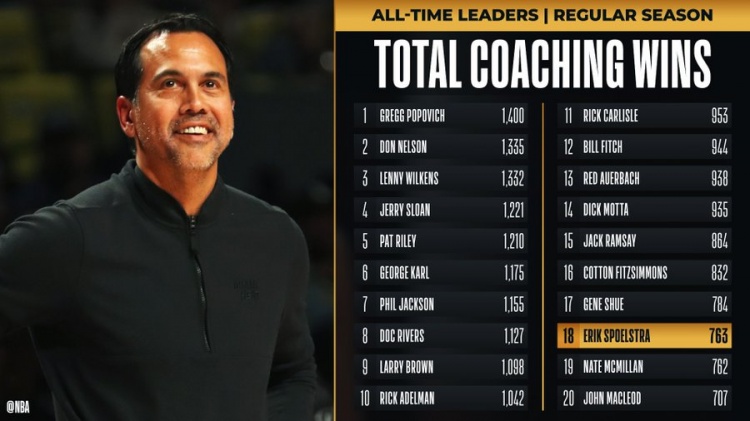 憑借本場勝利,熱火主帥斯波執(zhí)教生涯勝場數(shù)來到763勝,超越麥克米蘭,升至歷史第18位,下一位將追吉恩-舒(784勝)。