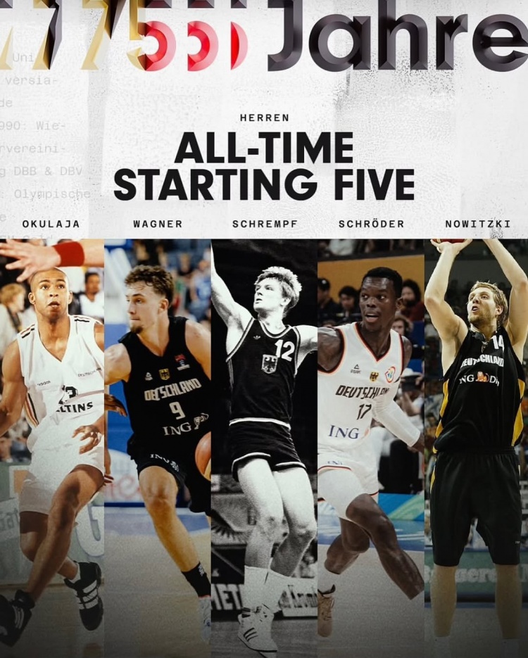12月13日訊 近日,德國(guó)男籃票選隊(duì)史首發(fā)五人組,分別是:奧庫(kù)拉賈、小瓦格納、施倫普夫、諾維茨基、施羅德。