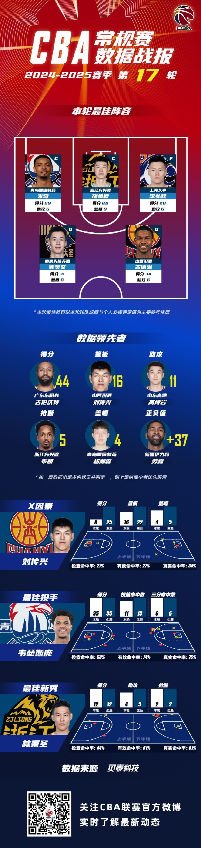 2024-2025賽季CBA聯(lián)賽常規(guī)賽第17輪結(jié)束較量,來自青島的米奇、廣廈的胡金秋、上海的李弘權(quán) 、同曦的郭昊文和山西的古德溫入選CBA聯(lián)賽常規(guī)賽第17輪最佳陣容!