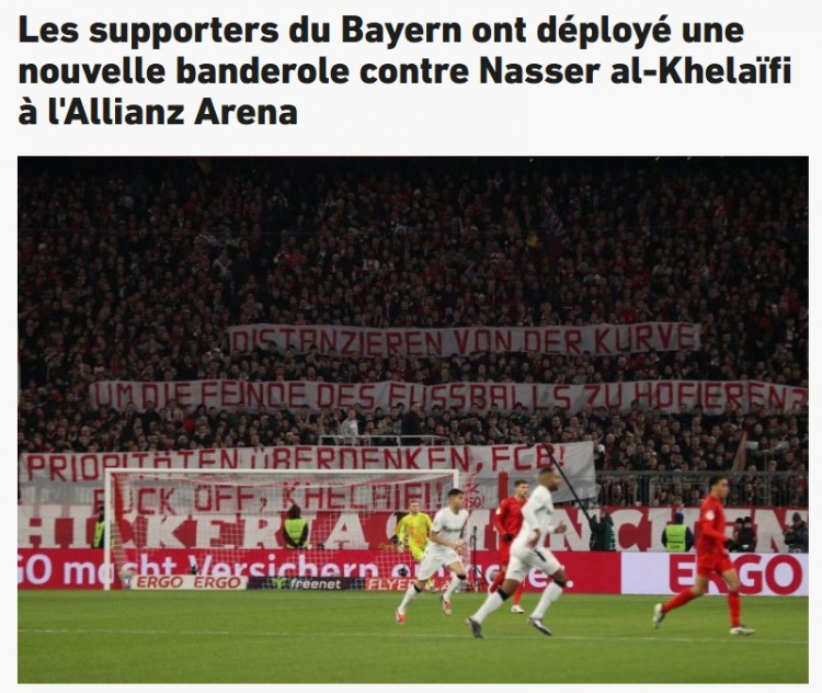 12月4日訊 德國(guó)杯,拜仁主場(chǎng)0-1不敵勒沃庫(kù)森遭淘汰。據(jù)《隊(duì)報(bào)》報(bào)道,賽中,安聯(lián)球場(chǎng)再次出現(xiàn)反對(duì)巴黎主席納賽爾的條幅。