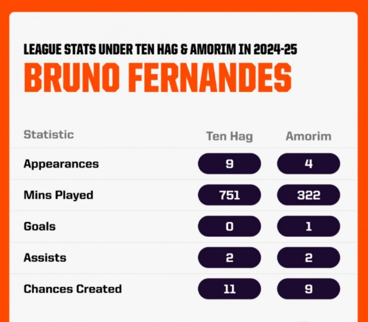 除特別注明外,本站所有內(nèi)容均為24直播網(wǎng)整理排版,轉(zhuǎn)載請注明出處:B費(fèi)本賽季在阿莫林麾下4場英超參與3球,滕哈赫麾下9場2球