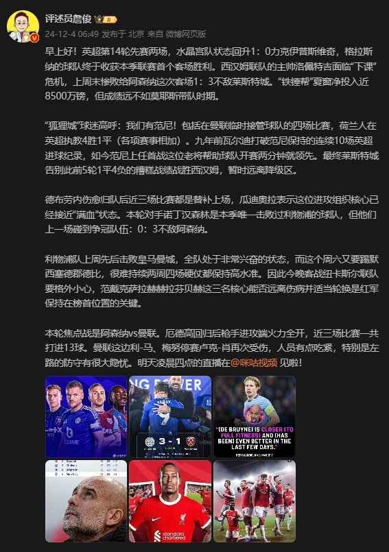 12月04日訊 英超14輪,萊斯特城3-1西漢姆聯(lián),水晶宮1-0伊普斯維奇。賽后,評述員詹俊做出點評。