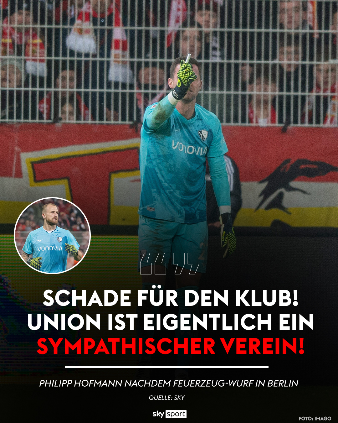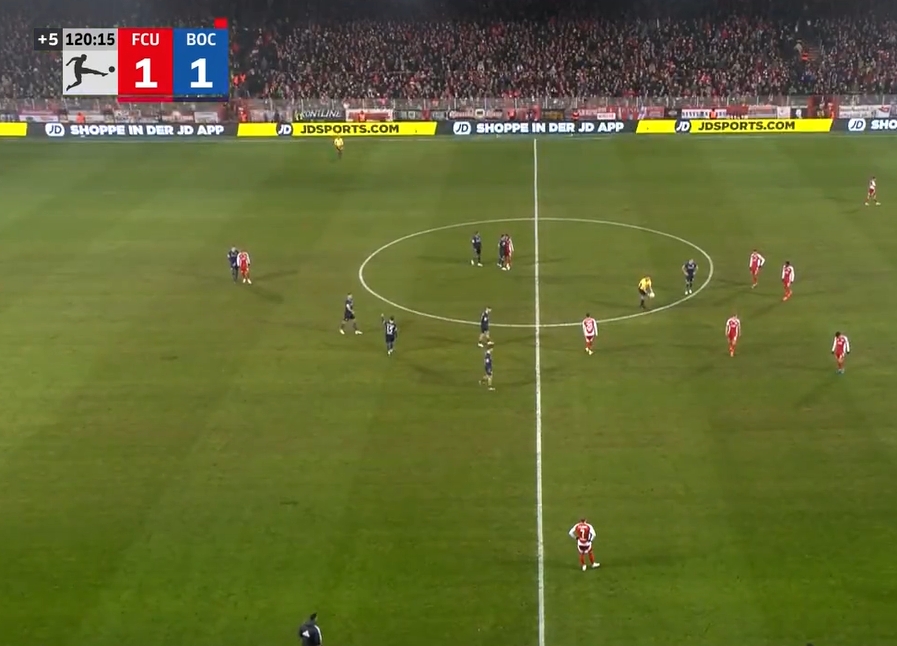 下半場(chǎng)補(bǔ)時(shí)第1分鐘,波鴻門將德雷維斯被柏林聯(lián)球迷扔下的打火機(jī)砸中,傷退后被送往醫(yī)院,裁判中斷比賽,兩隊(duì)球員返回更衣室。