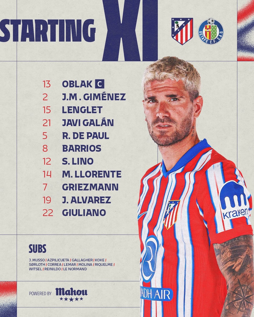馬競(jìng)首發(fā):13-奧布拉克、2-吉梅內(nèi)斯、15-朗格萊、21-哈維-加蘭、5-德保羅、8-巴里奧斯、14-馬科斯-略倫特、7-格列茲曼、12-利諾、19-阿爾瓦雷斯、22-朱利亞諾-西蒙尼