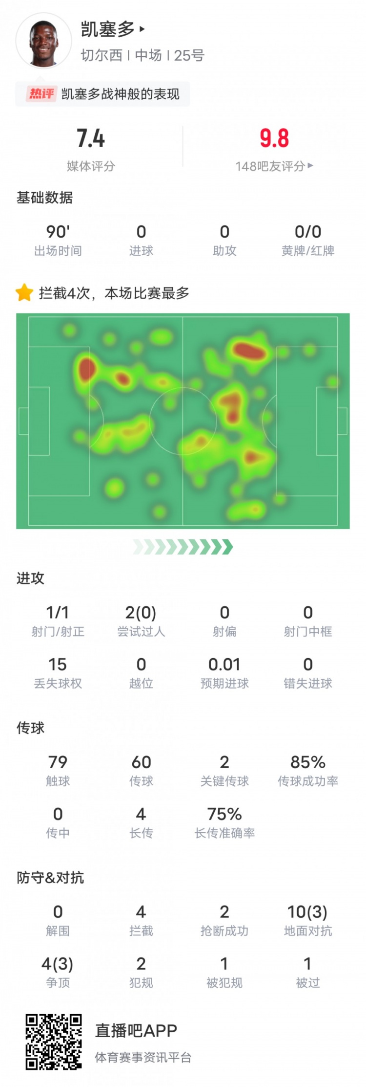 12月16日訊 本賽季英超第16輪,切爾西2-1布倫特福德。凱塞多首發(fā)出戰(zhàn),貢獻全場最多的4次攔截,還有2次關(guān)鍵傳球2次搶斷,評分7.4。
