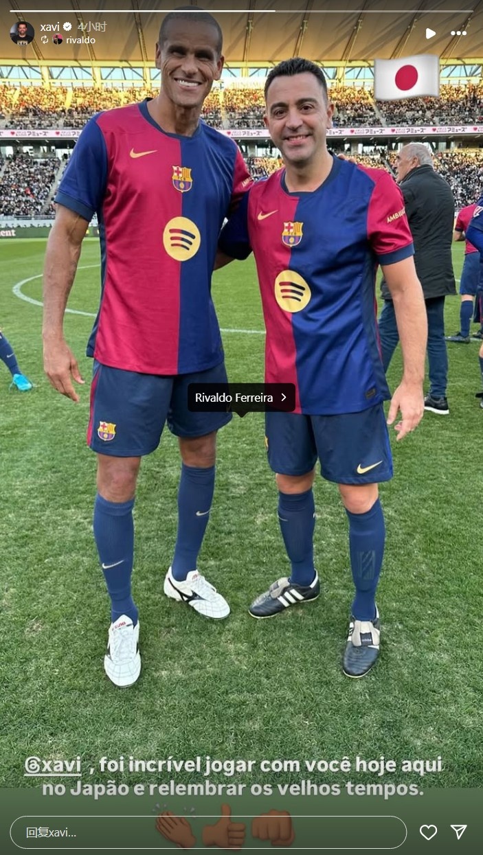 里瓦爾多曬出與哈維的賽場合照,并寫道:“今天能在日本和你一起踢球,回憶過去的時(shí)光,真是太棒了?!?/p>