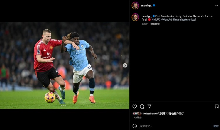 德里赫特曬出自己單防多庫時的照片,并寫道:首場曼市德比,首場勝利。這場勝利獻給球迷們!
