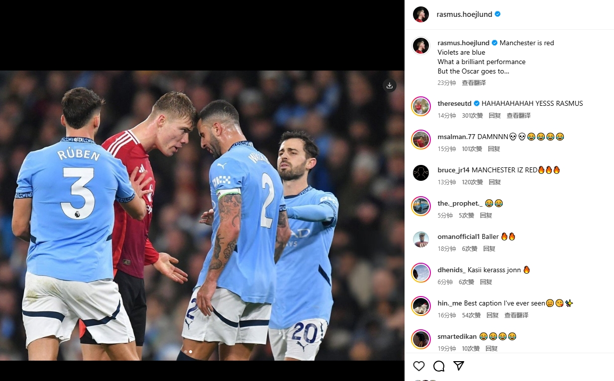 12月16日訊 曼聯(lián)2-1逆轉(zhuǎn)戰(zhàn)勝曼城,霍伊倫賽后發(fā)文慶祝,還調(diào)侃了沃克。