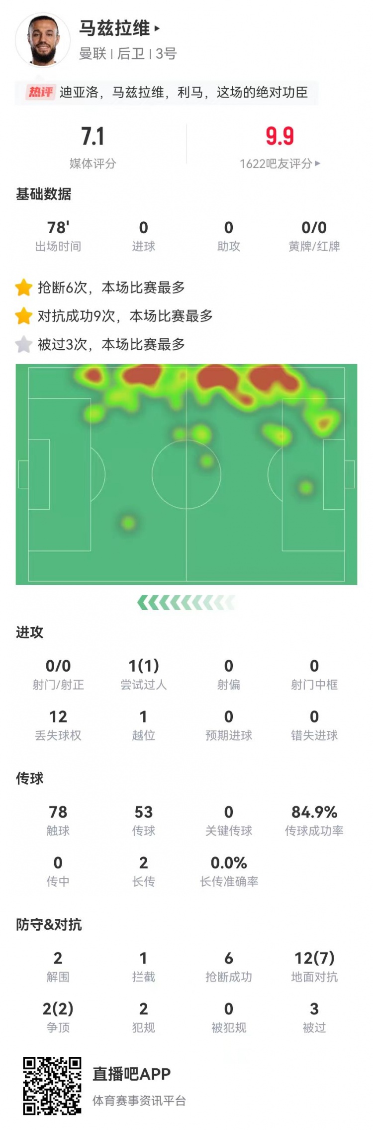 12月16日訊 曼聯(lián)在本輪英超2-1逆轉(zhuǎn)絕殺曼城,出任右翼衛(wèi)的馬茲拉維本場(chǎng)數(shù)據(jù)如下: