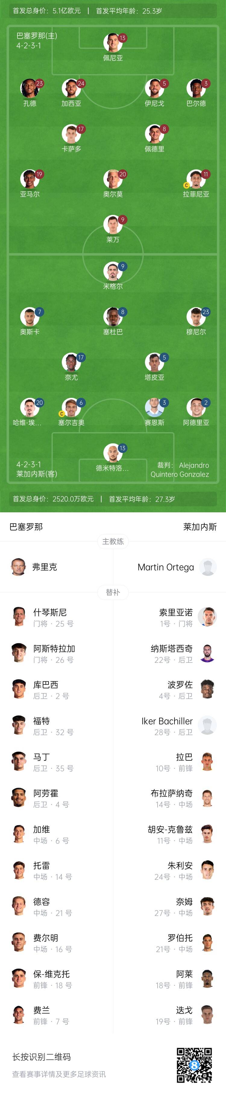 巴薩首發(fā):13-佩尼亞、3-巴爾德、5-伊尼戈-馬丁內(nèi)斯、23-孔德、24-埃里克-加西亞、8-佩德里、17-卡薩多、11-拉菲尼亞、19-亞馬爾、20-奧爾莫、9-萊萬