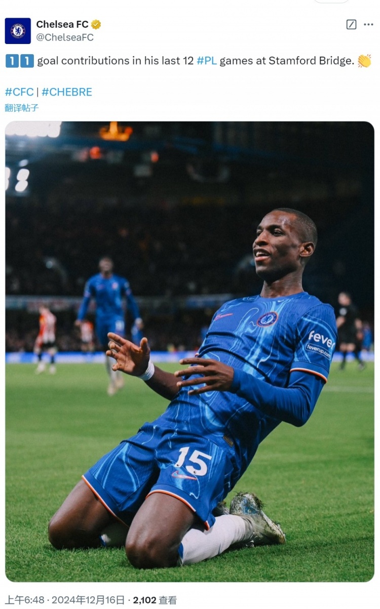 切爾西官方更新社媒動(dòng)態(tài),曬出杰克遜的數(shù)據(jù),近12場英超主場比賽,杰克遜參與11粒進(jìn)球。
