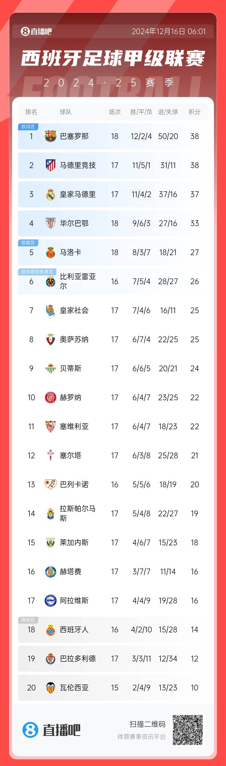 12月16日訊 西甲第17輪,巴薩0-1爆冷不敵萊加內(nèi)斯,皇馬3-3客平巴列卡諾,馬競(jìng)1-0小勝赫塔費(fèi)。