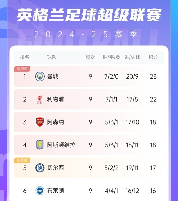 7輪只拿4分!曼城第9輪時7勝2平不敗1分領跑,現(xiàn)已落后榜首9分