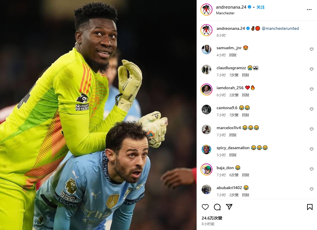 12月16日訊 英超第16輪曼市德比,曼聯(lián)2-1拿下曼城。賽后奧納納發(fā)社媒配圖力壓曼城攻擊手B席,評論區(qū)全是笑哭的表情包。