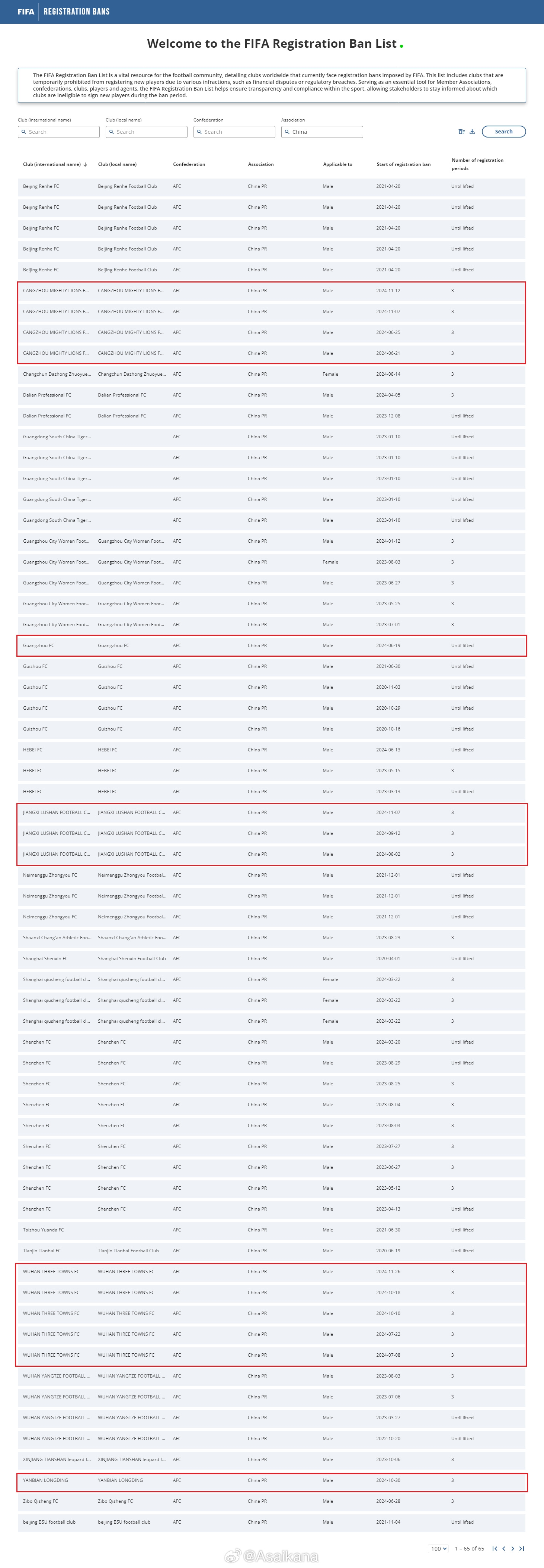 在12月16日例行更新的國際足聯(lián)注冊禁令披露系統(tǒng)中,目前還存在轉(zhuǎn)會注冊禁令的目前還存活的男足俱樂部為滄州雄獅(4條)、廣州(1條)、江西廬山(3條)、武漢三鎮(zhèn)(5條)、延邊龍鼎(1條)。 ?? ???