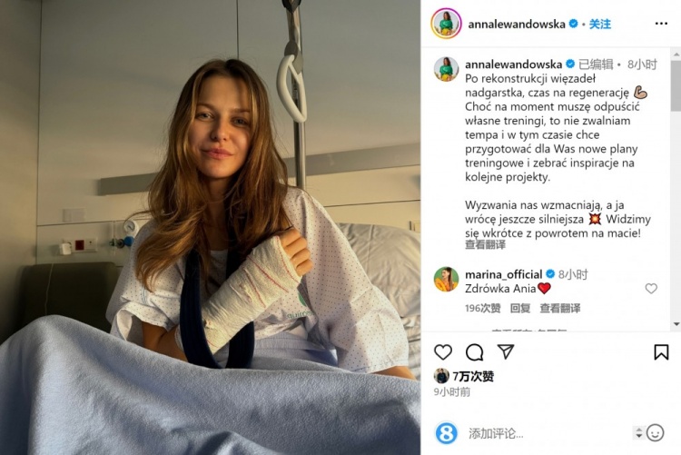安娜社媒曬出自己在病床上的照片,并寫道:“手腕韌帶重建后的恢復(fù)時(shí)間