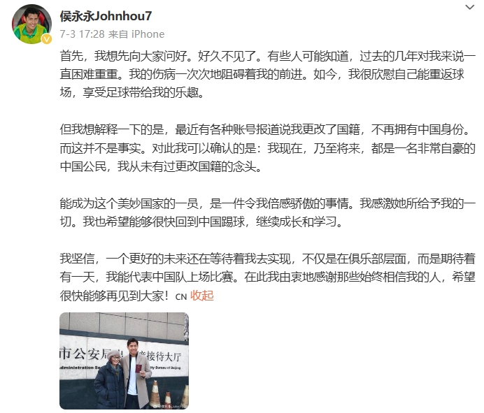 今年7月,侯永永親承自己從未有過更改國(guó)籍的念頭,期待著有一天能代表中國(guó)隊(duì)上場(chǎng)比賽。