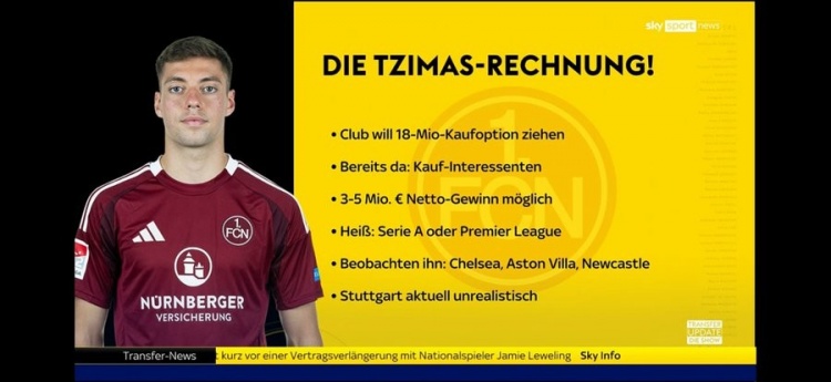 “齊馬斯本賽季被外租紐倫堡,在德乙13場7球2助攻,表現(xiàn)相當(dāng)搶眼。紐倫堡想要激活租借合同中的1800萬歐元買斷條款,他們計劃在明夏直接出售齊馬斯,從而獲得大概300萬到500萬歐元的利潤,談判正在進(jìn)行中?!?/p>