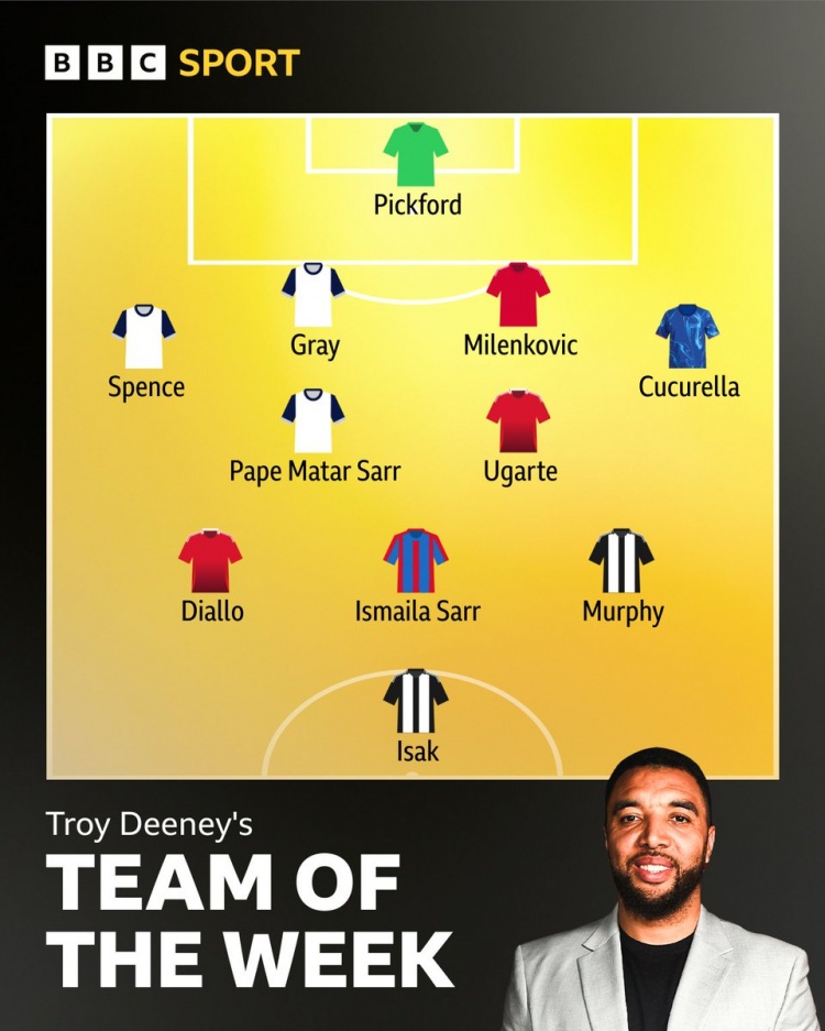 12月17日訊 迪尼評出了英超第16輪最佳陣容,阿瑪?shù)?、烏加特、伊薩克、庫庫雷利亞在列。