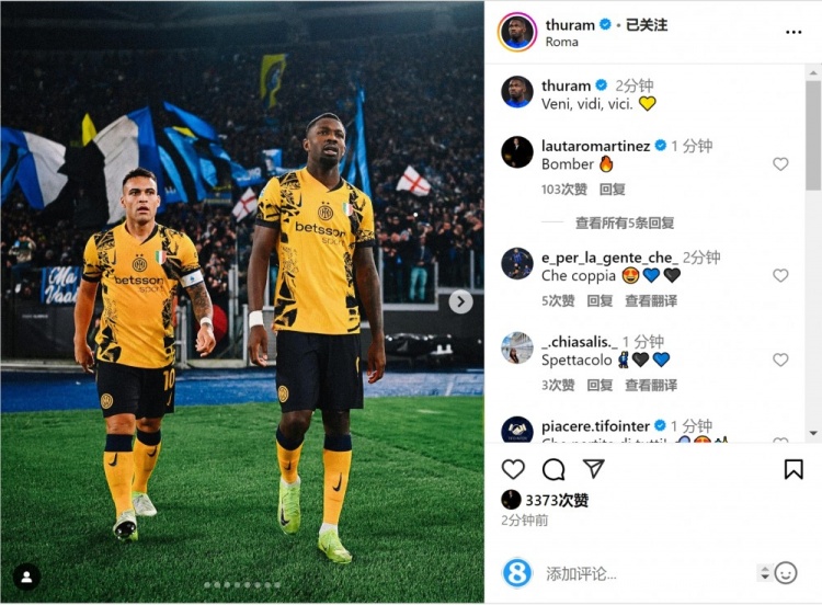 圖拉姆在社交媒體上曬出與勞塔羅的合照,配文:“我來(lái),我見(jiàn),我征服?!?/p>