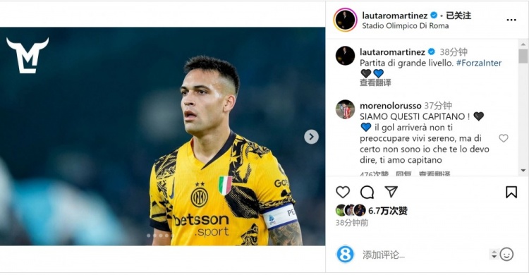 此役勞塔羅沒(méi)有進(jìn)球,但他的表現(xiàn)得到隊(duì)友和主帥的稱贊,賽后勞塔羅在社交媒體上曬出自己的比賽照片,并配文:“高水平比賽。”