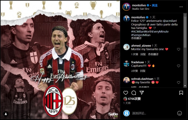 蒙托利沃寫(xiě)道:“米蘭125周年生日快樂(lè),自豪曾作為米蘭大家庭的一份子?!?/p>