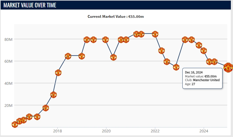 德轉更新最新英超球員身價,“紅魔太子”拉什福德的身價降至5500萬歐。