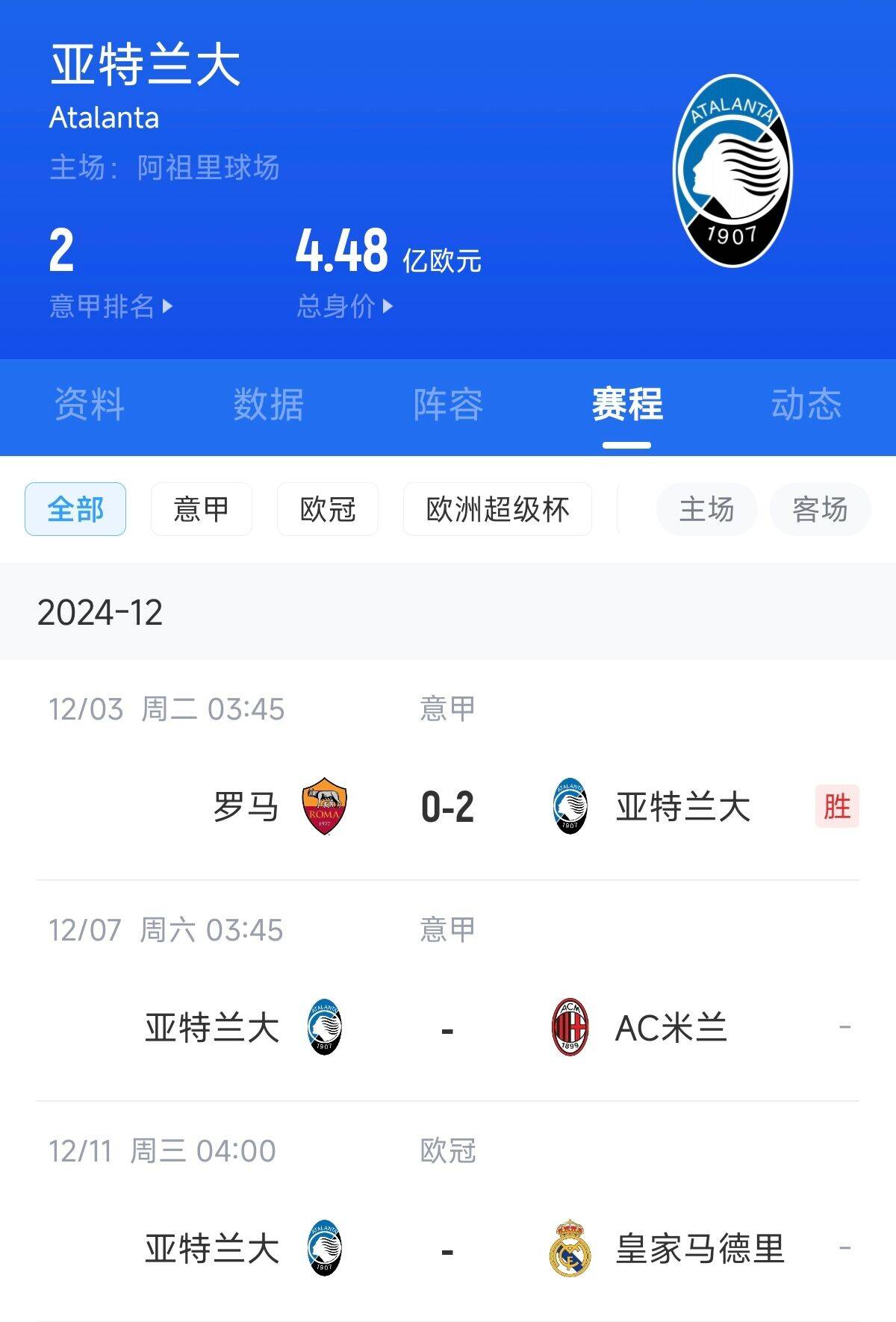 12月03日訊 意甲第14輪,亞特蘭大客場2-0擊敗羅馬,豪取各項賽事8連勝。