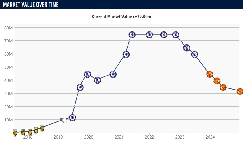 12月17日訊 昨日德轉(zhuǎn)更新英超球員身價(jià),曼聯(lián)7號(hào)芒特身價(jià)遭遇六連跌,自去年夏天加盟曼聯(lián)后身價(jià)降低2800萬歐,由2023年6月的6000萬歐元降至3200萬歐元。