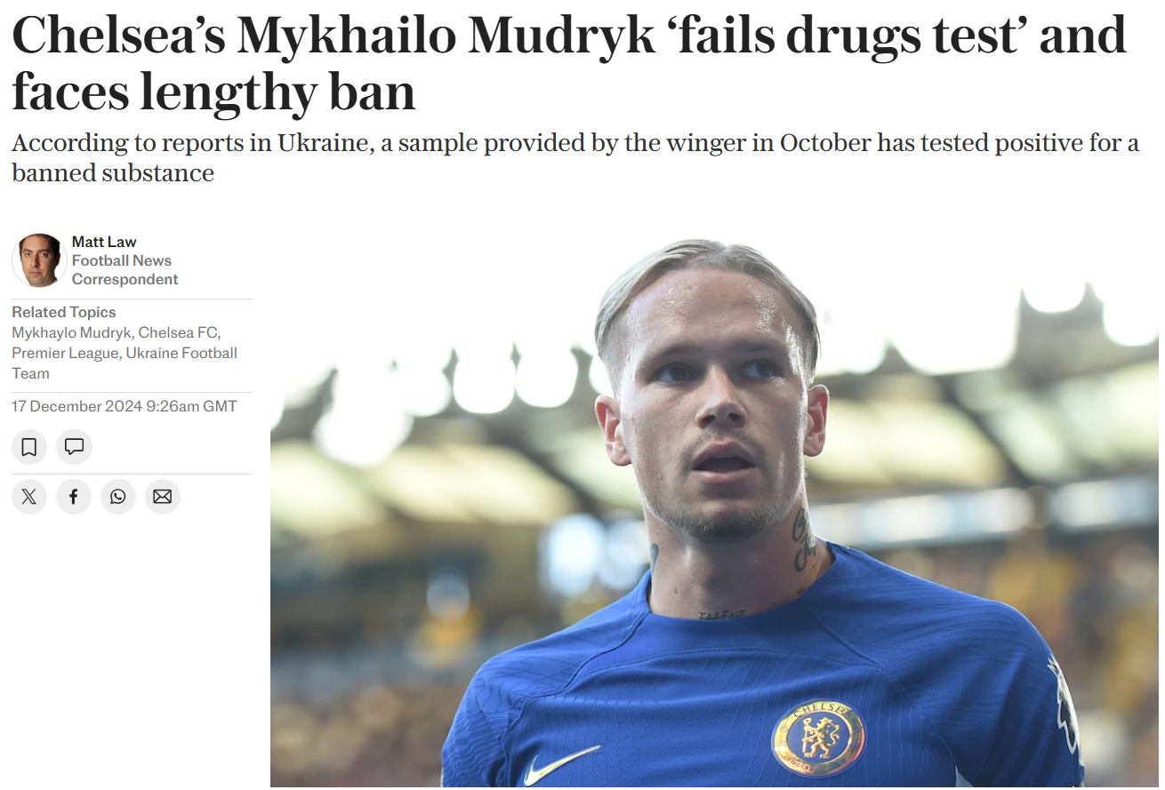 12月17日訊 烏克蘭方面曝出消息,切爾西邊鋒穆德里克興奮劑檢測(cè)呈陽性,恐面臨禁賽。英國(guó)《每日電訊報(bào)》就此事詢問了穆德里克以及切爾西。