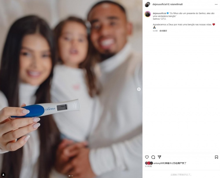 12月17日訊 阿森納前鋒熱蘇斯在Instagram上宣布妻子懷上了第二個孩子。