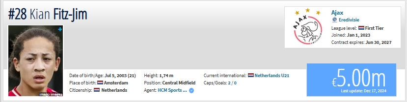 12月17日訊 德轉(zhuǎn)荷甲身價(jià)今日更新,來自阿賈克斯的21歲華裔球員菲慈佔(zhàn)-天樂最新身價(jià)為500萬歐。