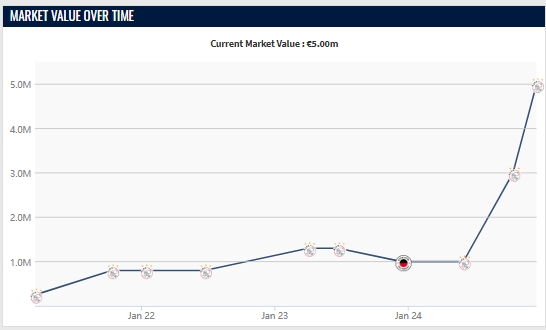 相較于上期更新,他本次又漲了200萬歐。而短短半年的2次身價(jià)更新,他從100萬歐暴漲5倍,可見他的成長速度之快。